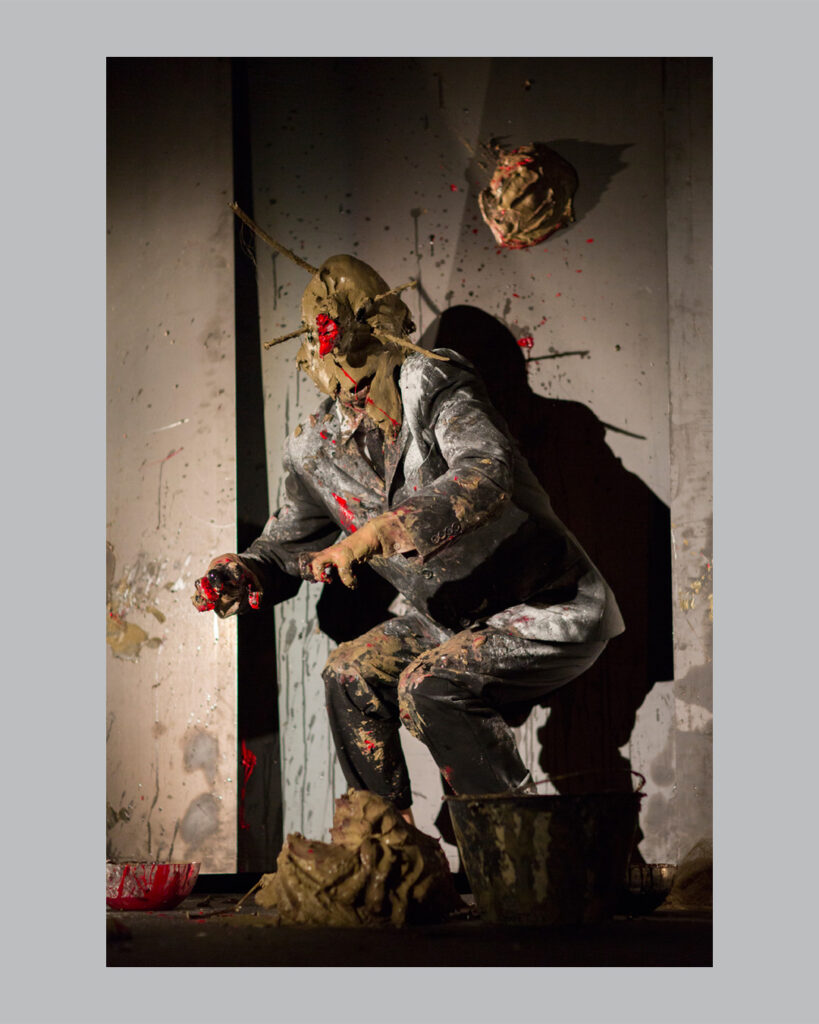 ساگازان در اجرا دگرگونیهای مختلف ماسک خاک رس مرطوب را پشت سر میگذارد و هر بار که این اتفاق میافتاد، کل بدنش نیز در طنین تغییر میکند. شخصیتهایی که شاید از حیوانات الهام گرفته شده، درحالی که اغلب شخصیتها احساس غیردنیایی داشتند. یک زامبی غمگین، جسد یک مرد که از باتلاق گلش دوباره زنده میشود. حرکات بدنش و فرمدهی به گل به قدری همصدا است که گل به مثابه عضو بدنش شده است. بیانش واقعا احشایی است، زیرا هنرمند گوشت گلآلود خود را پاره میکند و با لایههای ضخیم گل راههای تنفس خود را میبندد که تماشایش خفهکننده است. با ژست مکانیکی مثل یک عروسک تکان میخورد و سرش را در نور خم میکند. هنرمند بارها و بارها چهره خود را تخریب کرده و از نو میسازد. گاهی با وحشیگری هولناک سرش را به دیوار پشت سرش میکوبند. ریتم ضربات، نفس نفس و کت شلوار پاره و کثیف با دهانی همچون دهان دریده پاپ فرانسیس بیکن، به ما میگوید باید تمام کند اما یک نفر احساس میکند که باید ادامه دهد.
