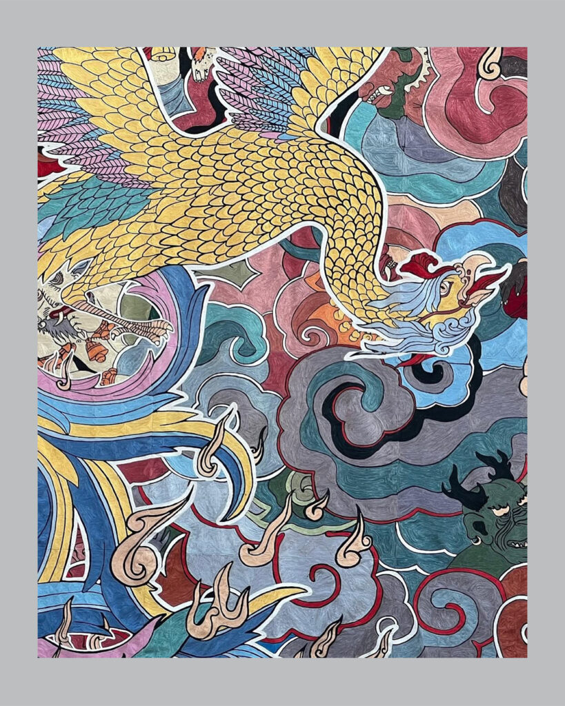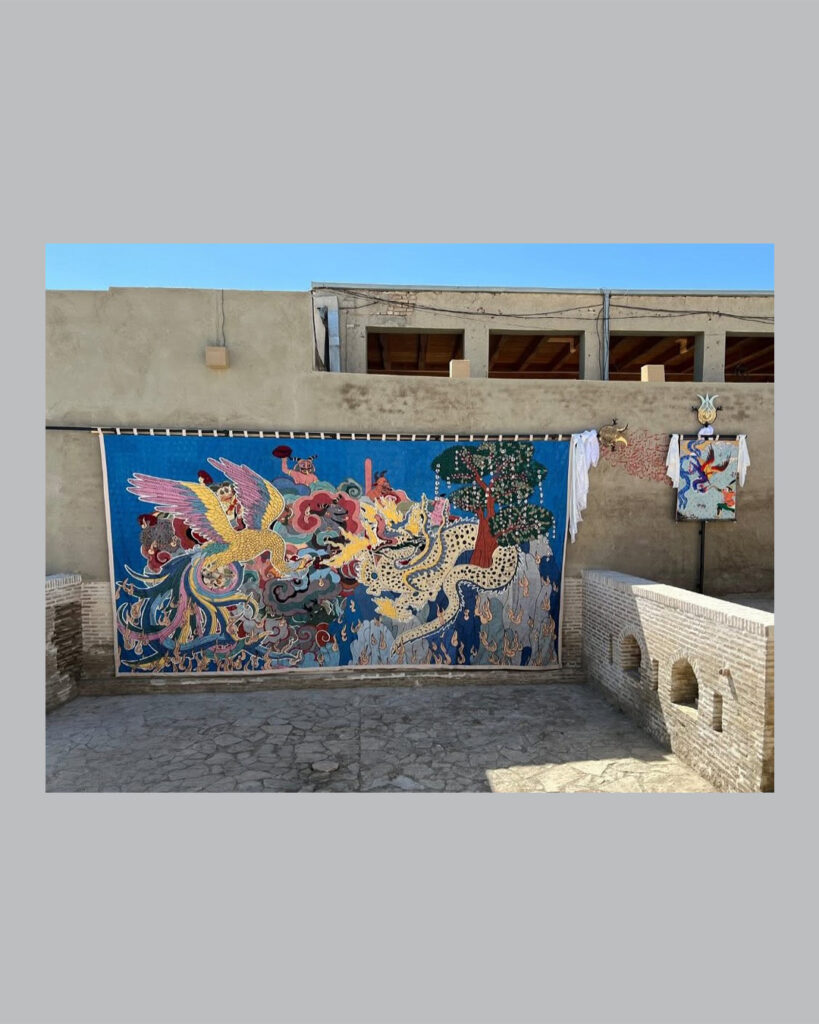بر اساس اولین تصاویر منتشر شده از این اثر منحصر به فرد میتوان نبردی اسطورهای و نمادین را که همان نبرد سیمرغ و اژدها است، مشاهده نمود. کهن الگو ی سیمرغ و اژدها در اسطوره های ایران و چین جایگاهی ویژه، ولی متفاوت دارند؛ چنان که کهن الگو ی سیمرغ در اسطوره و روان ناخودآگاه ایرانی-اهورایی، پرورنده، امداد غیبی و راهنما، امّا کهن الگوی اژدها، اهریمنی و پلید است؛ درحالی که این فرایند در اسطوره و روان ناخودآگاه چینی متفاوت است. همچنین در نقوش فرش و قالیهای ایرانی، خصوصاً فرشهای دوران صفوی، حاوی روایاتی نمادین است که با الهام از اسطورههای ملی در متن و حاشیه قالیها به زیبایی به تصویر کشیده شدهاند. نزاع سیمرغ و اژدها نیز یکی از این نقوش پر تکراری است که به شکل گرفت وگیر و در هیات تقابل رخ نموده است. بازنمود نمادین هر یک از این دو اسطوره شامل شاخصههایی چون نمادهای اهورایی و اهریمنی، نیکی و شر، زمین و آسمان، تیرگی و روشنایی، مرگ و زندگی و روح و نفس است که با الوهیت بخشی به اسطورههای بومی و در نظرگرفتن مواردی چون تکرار، بسامد و اصالت در دیده میشوند. ریشه اصلی این نزاع, بیانگر مفهوم خیر و شرّ برخاسته از تقابل اهورایی و اهریمنی این دو اسطوره و تاثیر رویکرد آیینی در شکل گیری این نزاع است. نزاعی که در آن، اهریمن با نماد مار و اژدها در حال ستیز با آیین تازهای به نام «مهر» با نماد سیمرغ است. بر این پایه و با توجه به آثار گذشته خادم علی – که خود مقالهای جداگانه برای تحلیل آنها میطلبد- واضح است که او نیز در پی نمایشی عظیم و نمادینی از نبرد خیر و شرّ و نیکی و پلیدی در جهان هنر معاصر و در پیوند با حافظه تاریخی سرزمینی تاریخی و پارسی بوده است. همچنین مطالب منتشر شده از این اثر نیز تحلیل فوق را تایید مینماید: «خادم علی با الهام از تاریخ و اشعار حماسی فارسی که تاریخ بخارا را با میراث خود پیوند میدهد، با همکاری سنجر نظروف، هنرمند گلدوزی و گلدوزیهای افغان (که برای ادامهی هنرشان ناشناس باقی ماندهاند) یک پردهی منقوش دو قسمتی عظیم خلق نموده است. این پرده با فلزکاری درخشانی که با شعری از سعید کمالوف آهنگر و اشعار رودکی شاعر افسانهای که عطر باد در بخارا در قرن دهم را توصیف کرده، تزئین شده است و به دیوار متصل گردیده. این اثر داستان سیمرغ، پرندهی افسانهای خیرخواهی را روایت میکند که بارها مردم را از نابودی جهان محافظت کرده و تاریخ بشریت را از برخی از عمیقترین گونههای دلشکستگی قابل تصور، عبور داده است. به گفتهی این هنرمند، «روزی کسی از مرد خردمندی پرسید… که آیا تا به حال فقط یک سیمرغ وجود داشته است؟ او پاسخ داد: «بله، برای کسانی که نمیدانند. اما هر دورهای سیمرغ خودش را دارد. پس از از دست دادن مادرم، کمکم او را در سیمرغ دیدم، التیامبخش قلبهای شکسته، حضوری که درد اشتیاق را تسکین میدهد، و مادری که در سکوت بازمیگردد»».