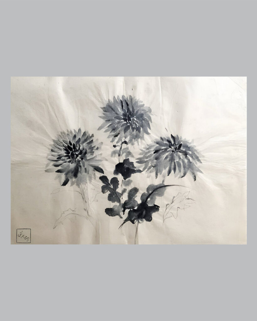 سومیه (Sumi-e) نوعی نقاشی سنتی شرق آسیاست، بهویژه در چین و ژاپن، که با مرکب سیاه و قلممو روی کاغذ یا ابریشم انجام میشود. اتودهای سومیه گنجی در ظاهر از سنت نقاشی مرکب شرق آسیا الهام گرفتهاند، اما بیشتر از آنکه به بازنمایی وفادار باشند، به بررسی رابطهی قلم، آب و کاغذ میپردازند. این مجموعه از چند طراحی ساده با مرکب روی کاغذ تشکیل شده که در آنها سوژههایی مثل گل، سنگ و بامبو بهعنوان بهانهای برای مطالعهی رفتار ماده بهکار رفتهاند. در این آثار، قلمگذاریها بین کنترلشده و آزاد در نوساناند. بخشهایی از کار بر دقت و ضرباهنگ خط تکیه دارند، در حالی که بخشهای دیگر به نشت، نفوذ و پخششدن مرکب در بافت کاغذ وابستهاند. همین تغییر کیفیت باعث میشود فرمها از حالت توصیفی فاصله بگیرند و به ساختاری تجربیتر نزدیک شوند.