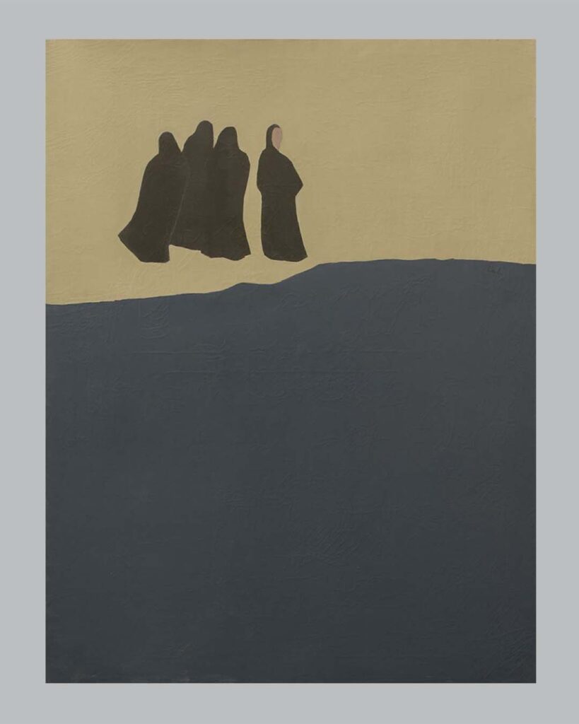 درنهایت، روند کاهش عناصر بصری به حد اعلی میرسد و آثار او به مینیمالیسم نزدیک میشوند. فیگور گاه به مرز نشانه نزدیک میشود و فضا بیش از پیش تهی میگردد؛ ترکیببندی و رنگها به گونهای هستند که هر عنصر، هر خط و هر فرم، نیاز به حضور و توجیه خود دارند. نقاشی دیگرعرصه نمایش احساس یا روایت نیست؛ بلکه میدان تمرکز بر سطح، فرم و ادراک بصری است. در این مرحله، آثار وی تجربهای مستقیم و سکونمحور از دیدن ایجاد میکنند که تماشاگر را وادار به مکث و مشاهده دقیق مینماید.
