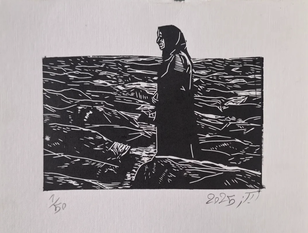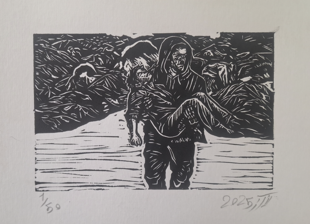 این آثار نه صرفاً برای دیده شدن، بلکه برای تثبیت یک وضعیت در حافظه جمعی خلق شده‌اند. چاپ لینو در اینجا به رسانه‌ای برای ثبت، مقاومت، و جلوگیری از محو شدن تجربه تبدیل می‌شود. هیچ‌یک از تصاویر این مجموعه به پایان نمی‌رسند؛ نه دفنی رخ می‌دهد و نه آرامشی حاصل می‌شود. هنرمند آگاهانه لحظه‌ای را انتخاب کرده که بسته نشده است. این تعلیق، مخاطب را از جایگاه تماشاگر بیرون می‌کشد و به موقعیت شاهد می‌نشاند. شاهد بودن، مسئولیت می‌آورد؛ و این شاید مهم‌ترین لایه‌ی این مجموعه باشد.